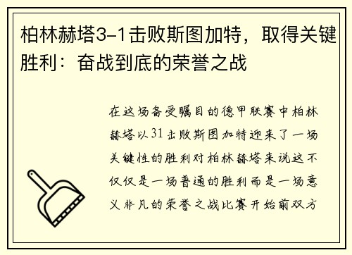 在这场备受瞩目的德甲联赛中,柏林赫塔以3-1击败斯图加特,迎来了一场关键性的胜利。对柏林赫塔来说,这不仅仅是一场普通的胜利,而是一场意义非凡的荣誉之战。比赛开始前,双方都承受着不小的压力,特别是柏林赫塔,他们在积分榜上面临着激烈的竞争,每一分都显得至关重要。